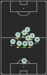 Per cominciare: la squadra di Inzaghi, orfana di 2 delle 4 fonti di gioco (cioè Bastoni e Mkhitaryan squalificati, gli unici in campo erano quindi Barella e Calhanoglu), ha scelto di spostare in avanti il baricentro e non optare per i classici interscambi di posizione, non potendo liberare altri registi, volendo così aggirare il castello difensivo della Roma. I giallorossi, consci delle defezioni nerazzurre, hanno deciso quindi di non farsi attrarre dal palleggio nerazzurro mantenendo un baricentro basso e alternando marcature a zona e a uomo (pensate che il baricentro medio in non possesso nel 1T è stato pari a 34 metri).